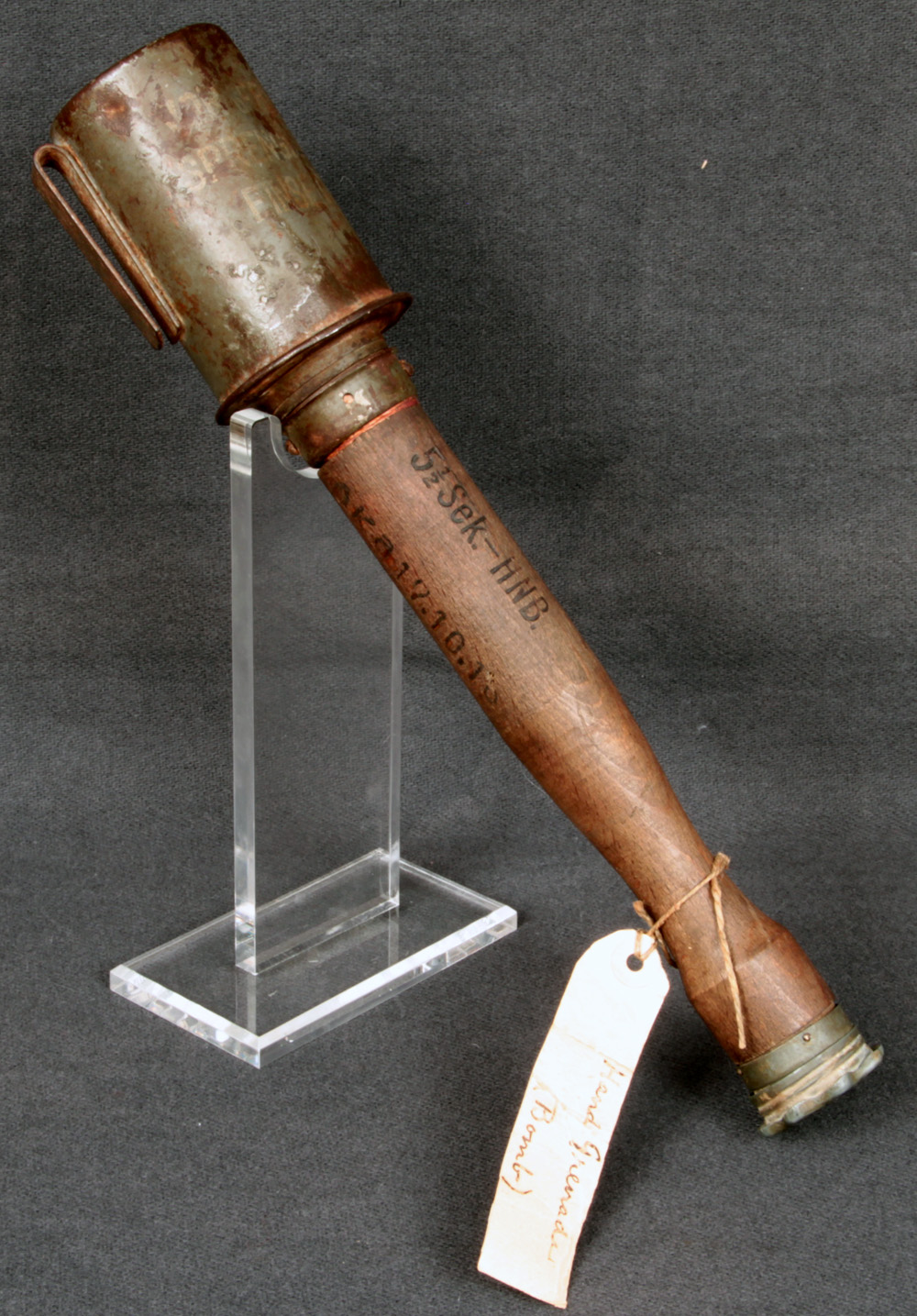 木製のハンドルには、ヒューズ(導火線)時間と手榴弾の製造日が記されていた。手榴弾の頭部にはベルトフックが組み込まれており、手榴弾がベルトやブービートラップとしての柵に吊されていた。