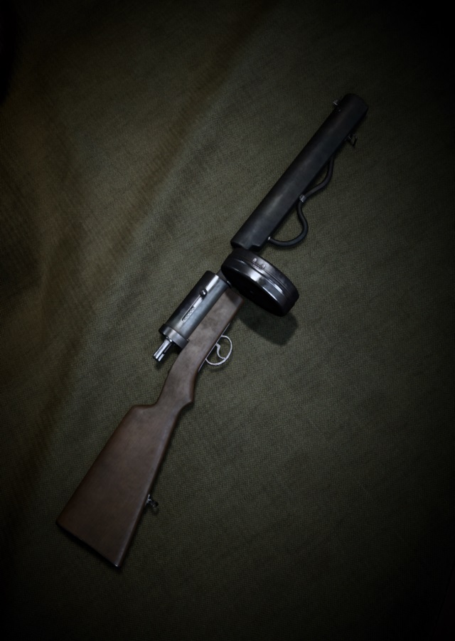 HELLRIEGEL 1915サブマシンガン サブマシンガンという用語が定着する前の1015年にオーストリア=ハンガリーで生み出されたこの銃は、ドイツ製のスネイルマガジンからのベルト給弾により9mm弾を発射し、銃身に水冷式のジャケットを装備している。記録によればヘルリーゲルの苗字を持つ人物にちなんで名付けられたとされる。